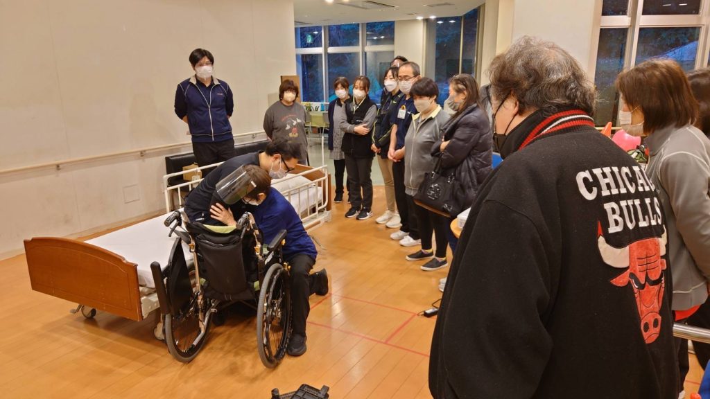 トランスファーボードを使ったベッドと車椅子のご利用者の移動方法の研修を実施しました。